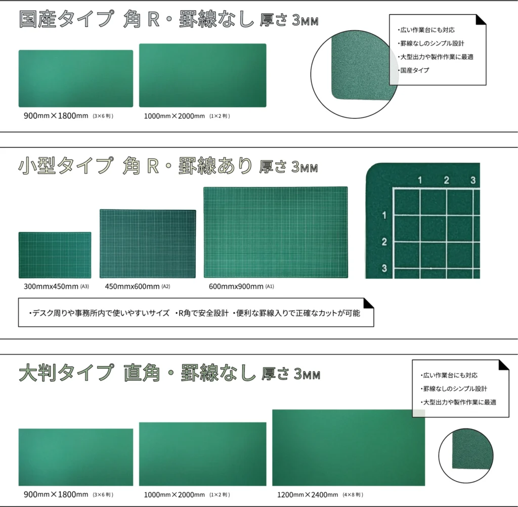 2026.02.17 規格追加 カッターマット規格追加のご案内 カッターマットの追加規格をを新たに発売いたしますのでご案内申し上げます。 製品 ● カッターマット 特徴 大判に関しては要望の多かった4×8判(4つ角:直角)を新発売※3×6判/1×2判の4つ角:直角タイプに関しては4月発売予定 ・小型タイプはデスク周りや事務所内で使いやすいサイズを 3 種類ご用意※こちらは使いやすいように罫線入りの角 R タイプとなります 前の記事へ 一覧へ戻る